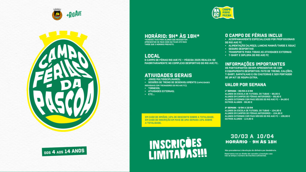 Assim como em anos anteriores o Rio Ave FC organiza mais um Campo de Férias da Páscoa. Duas semanas onde podes usufruir de diversas atividades no nosso Clube. Se queres fazer parte da diversão faz a tua inscrição na Rio Ave Store. As inscrições são limitadas por isso não percas tempo e agarra esta oportunidade!